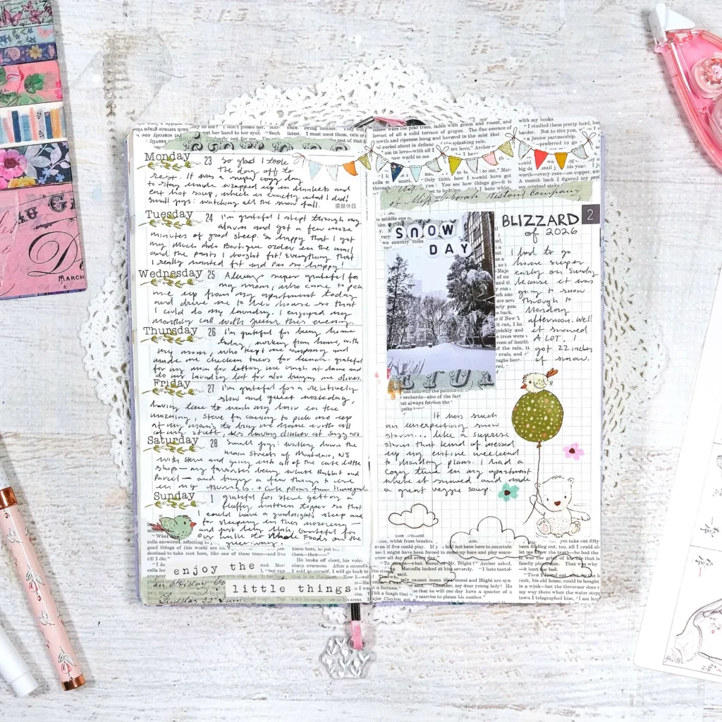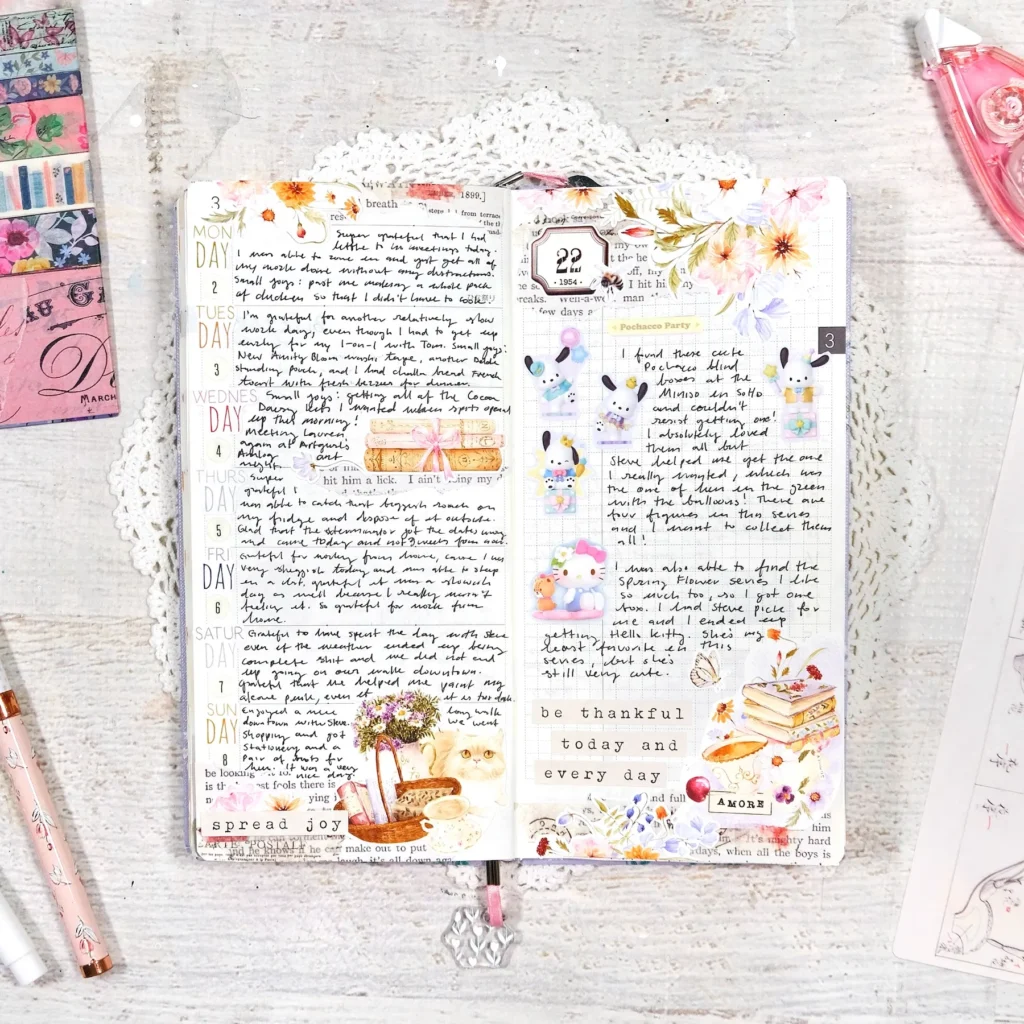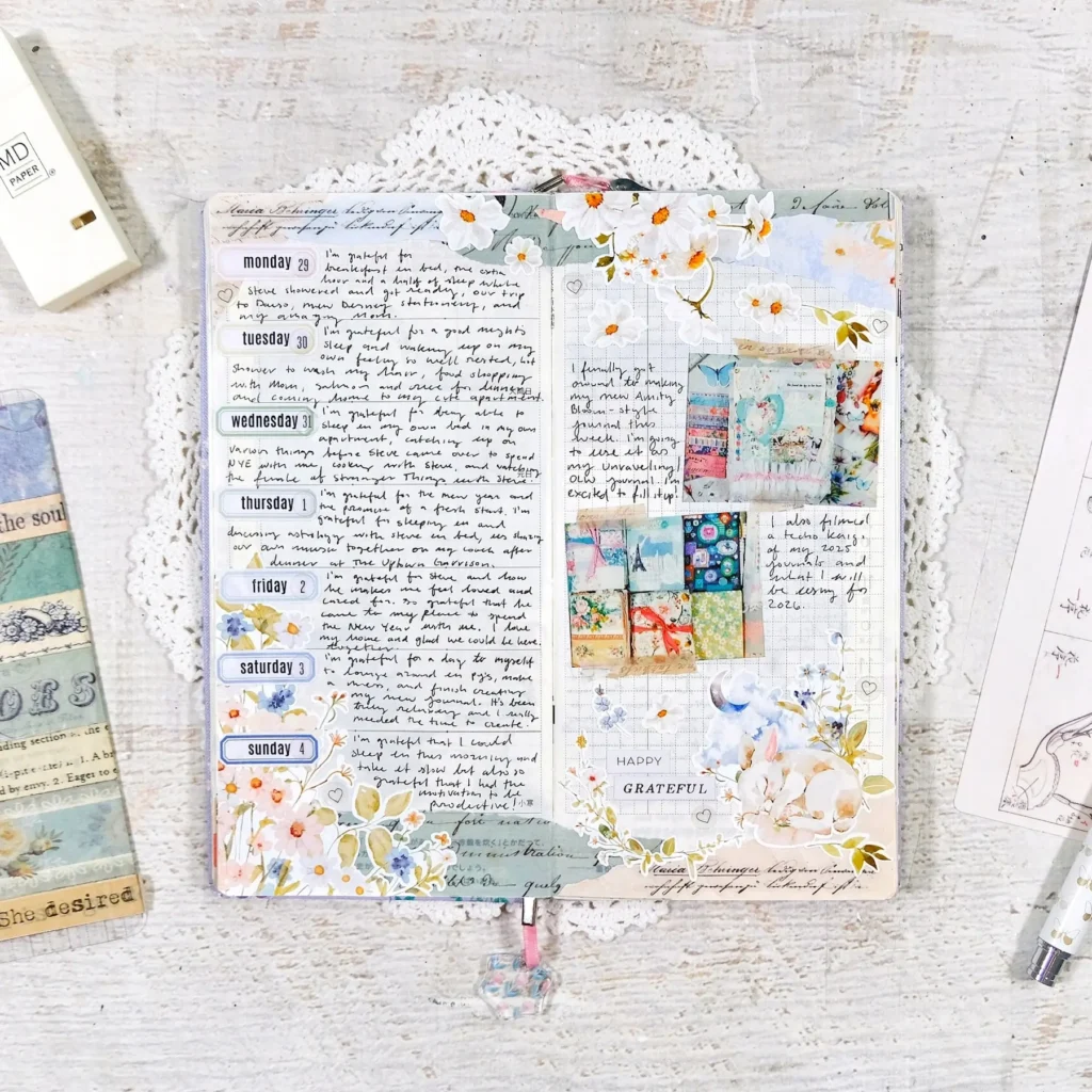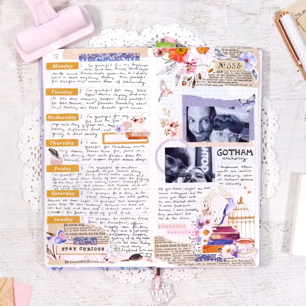I wanted to share the pages of my Gratitude Joy Journal that I’ve been keeping in a Hobonichi Weeks this year. I’m using a 2025 Yumi Kitagishi weeks and have been redating the pages with my Cocoa Daisy kits. It’s been working out fantastically! The Cocoa Daisy monthly calendar stickers are amazing and makes it super easy for me to redate the monthly pages too. I’ve also been utilizing a lot of the decorative stickers that I’ve been hoarding for years and it’s just been really fun to decorate and fill up these pages.